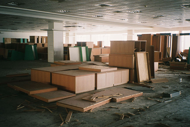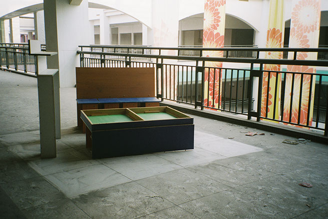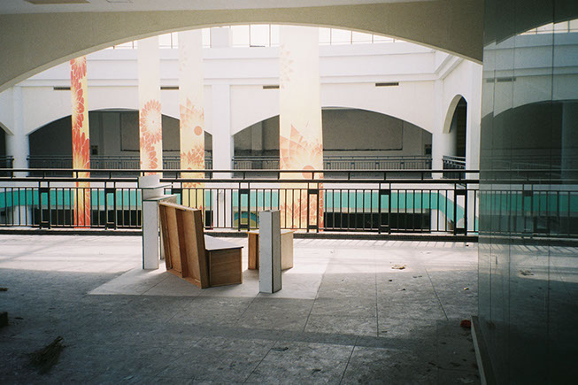 The project explores the empty half of the shopping mall by rearranging the found furniture in an abandoned bookstore (shelves and cupboards) into stage sets of living rooms. These sets will remain in the mall until their discovery.